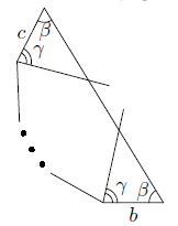 Если n = 2k, то k главных диагоналей разрезают правильный n-угольник на n равных треугольников. Докажем, что при нечётном n требуемое разрезание невозможно. Первый способ. Предположим, что правильный n-угольник P разрезан на равные треугольники. Рассмотрим те из этих треугольников, в которых одна из сторон является стороной P. Против этих равных сторон в каждом таком треугольнике лежит одинаковый угол α. Пусть остальные два угла треугольника равны β и γ. Возможны два случая. 1) β < γ. Назовём сторону n-угольника β-стороной или γ-стороной в соответствии с тем, какой угол примыкает к её левому концу (если смотреть изнутри). Выберем некоторую β-сторону b и в примыкающем треугольнике разрезания рассмотрим сторону угла β, лежащую внутри P. Она лежит на диагонали, и на другом конце эта диагональ также образует угол β с некоторой стороной c многоугольника (рис. слева). Этот угол не может быть разрезан на углы другими диагоналями (иначе угол разбиения, примыкающий к c будет меньше β, а такого угла в треугольнике нет). Итак, наш угол β принадлежит треугольнику, примыкающему к γ-стороне. Наоборот, рассматривая угол β, примыкающий к произвольной γ-стороне c, мы найдём β-сторону b, сопоставленную ей. Итак, β- и γ-стороны разбиваются на пары, и общее их количество чётно. Противоречие.