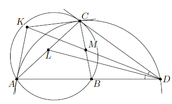 Дан треугольник ABC. Касательная в точке C к его описанной окружности пересекает прямую AB в точке D. Касательные к описанной окружности треугольника ACD в точках A и C пересекаются в точке K. Докажите, что прямая DK делит отрезок BC пополам.