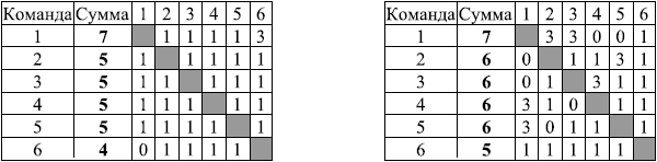 Приведём два возможных примера для турнира, в котором участвовали шесть команд: