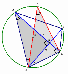 Применив этот факт к треугольнику АВD (рис. справа), получим, что из условия ∠ВАО = ∠DAC и единственности перпендикуляра, опущенного из точки А на прямую BD, следует, что АР ⊥ BD.